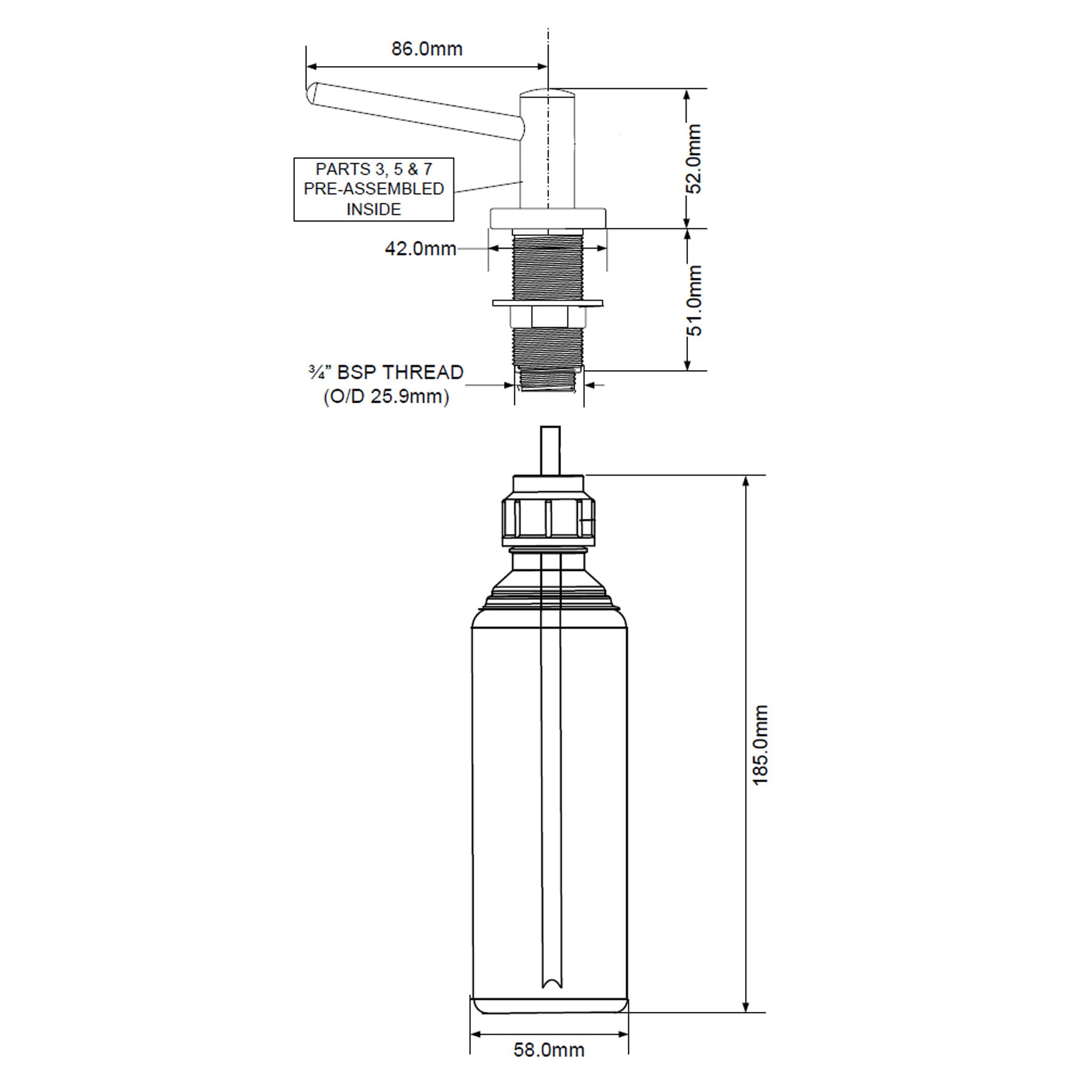 Dozownik do płynów, mocowany w blacie, zlewozmywaku lub umywalce. Element dozujący wykonany z mosiądzu, pokryty warstwą chromu.
